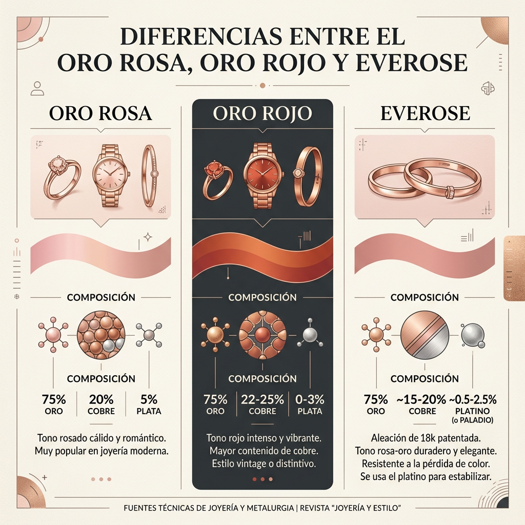 La diferencia entre oro rosa, rojo y Everose radica fundamentalmente en su composición química. Mientras el oro tradicional es 24 quilates y puro, estos tonos especiales se logran mezclando diferentes proporciones de metales: